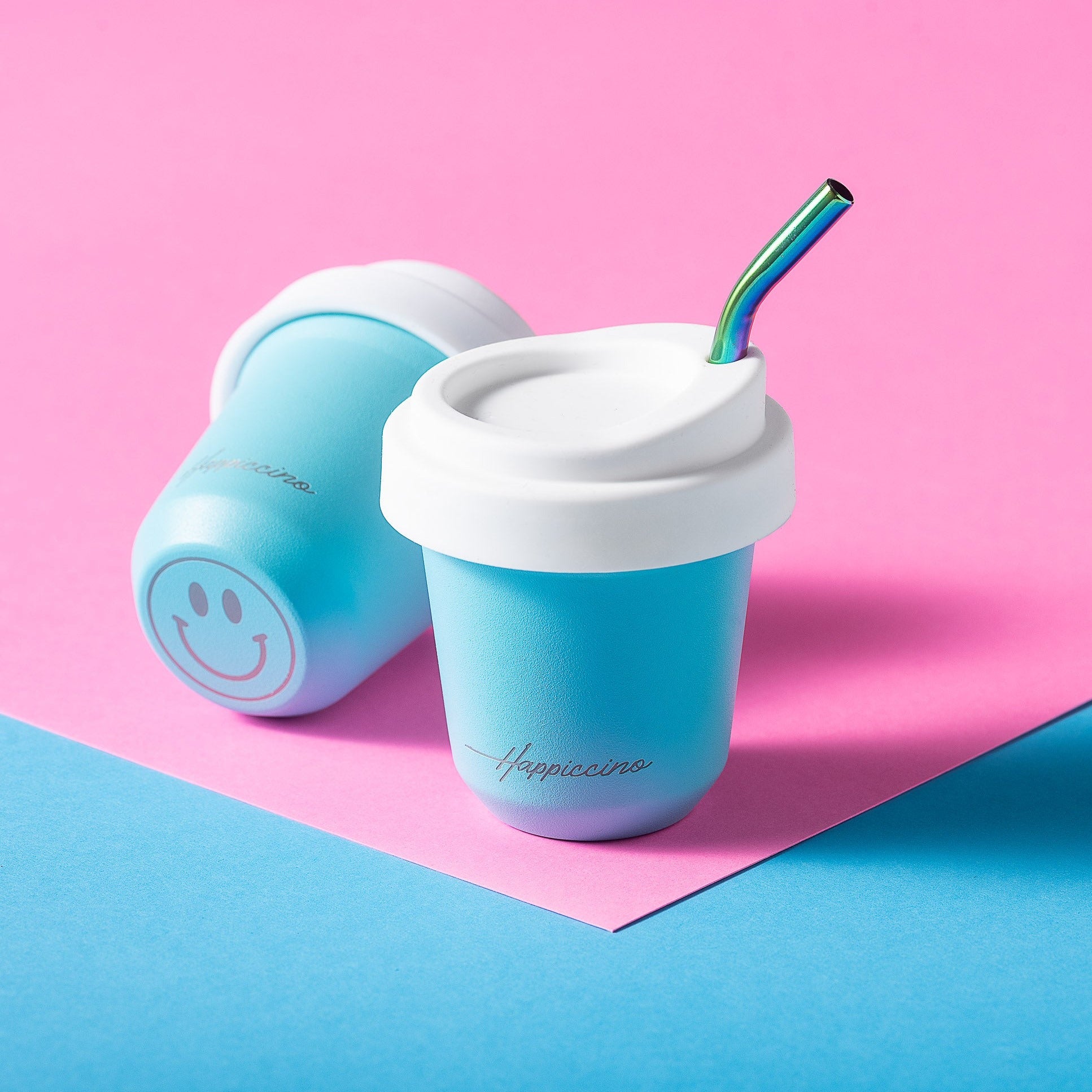 The 75ml cup comes with a lid, a steel rainbow straw, a Happiccino protective bag and a Happiccino gift cylinder. Cup, lid and straw are 100% dishwasher safe!
